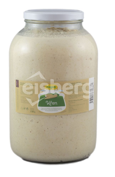 Čerstvý mletý křen (65%), pitná voda ,rostlinný olej slunečnicový, glukózový sirup, ocet kvasný lihový, zahusťovadlo: modifikovaný kukuřičný škrob, jedlá sůl, regulátor kyselosti :kyselina citrónová, přírodní aroma, konzervační látka- disiřičitan sodný, antioxidant :kyselina askorbová, sladidlo- sacharin