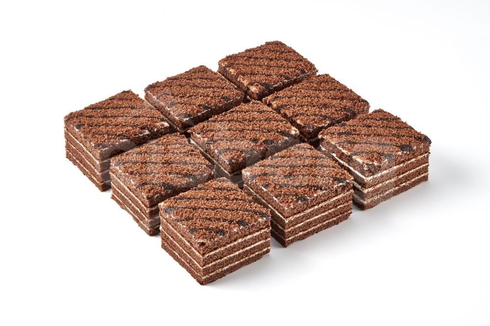 Vrstvený medový, kakaový dort s mléčným krémem, zdobený medovou drobenkou. Cukrářský výrobek s náplní lehkou tukovou (52 %).