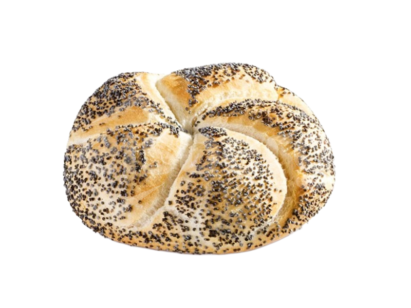 Světlé pšeničné pečivo s měkkou průžnou střídkou a typickou ražbou na povrchu. Posypané mákem