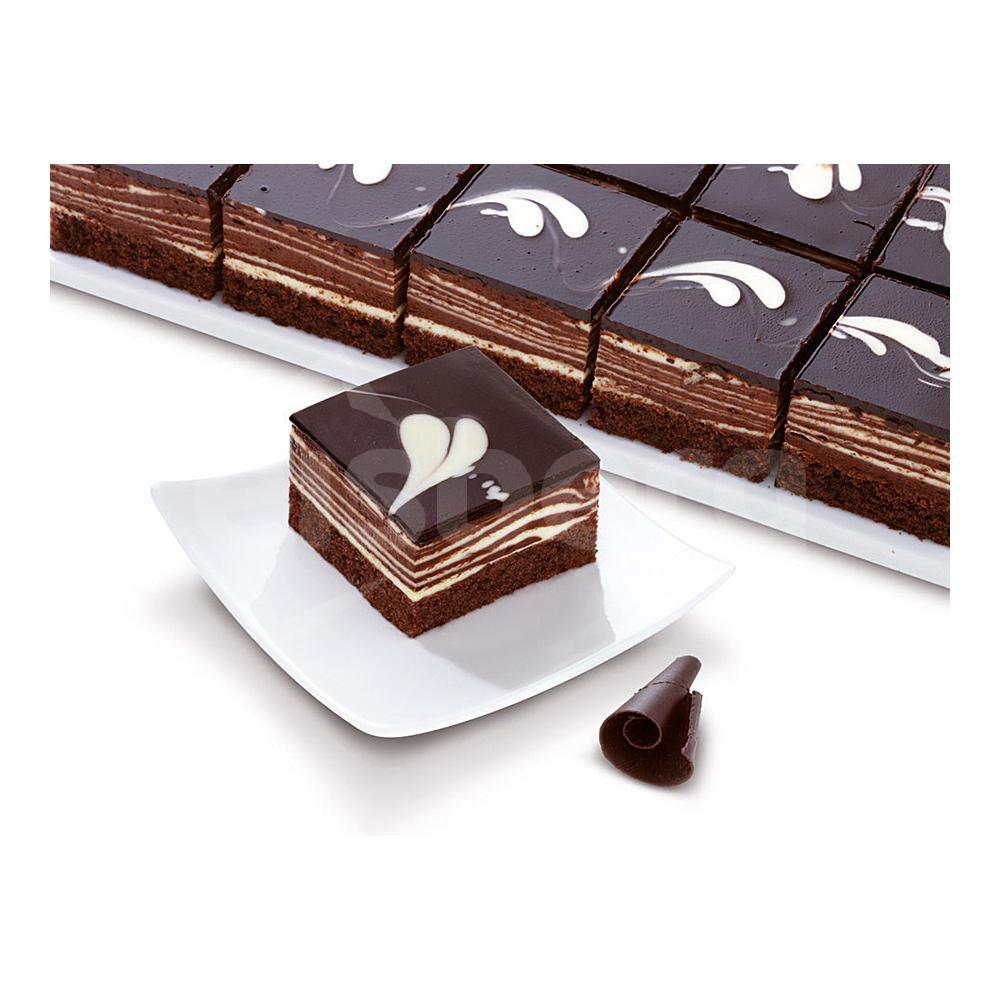 Nepřekonatelná kombinace bílého mousse a čokoládového mousse - nadýchané a lehce se vinoucí jeden do druhého na tmavě zbarveném moučníkovém základu a s jedinečnou dekorací.