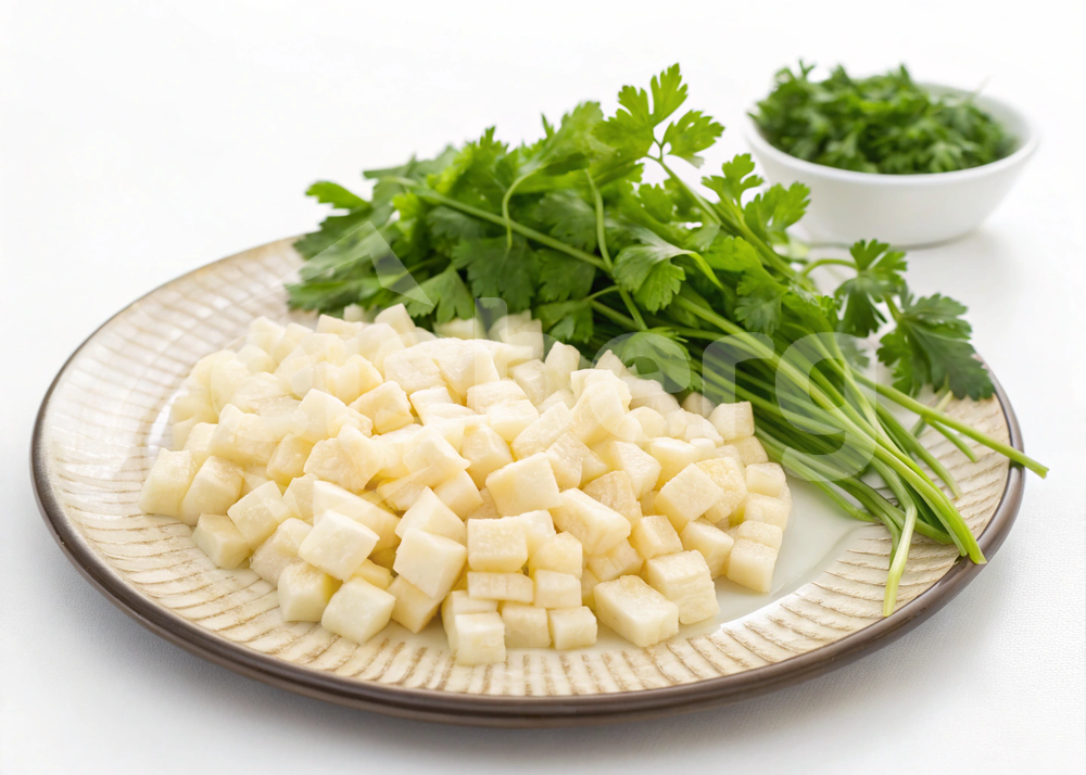 Kořen petržele krájený na kostičky.